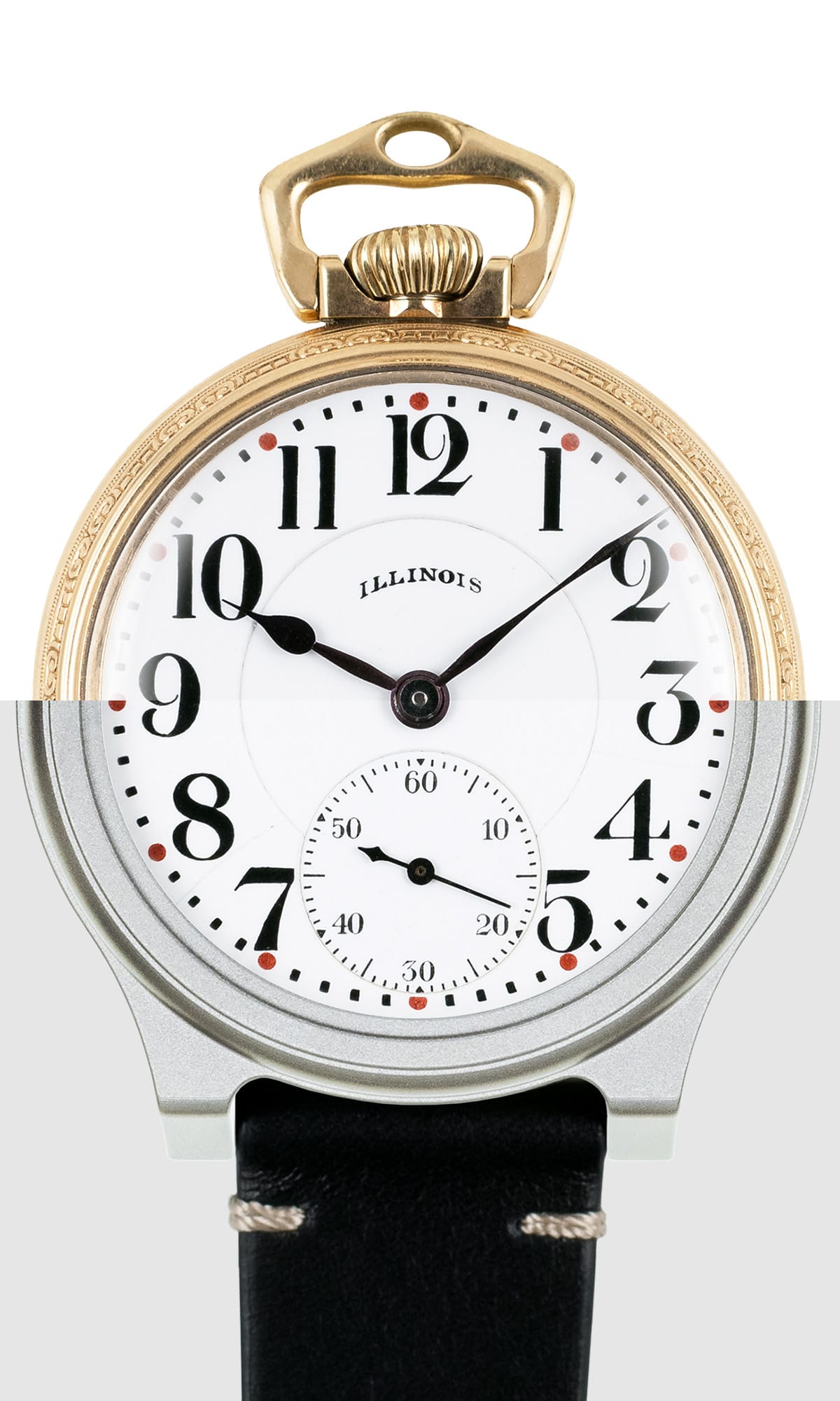 Our expert team of watchmakers restores the antique movement and then we manufacture a custom wristwatch case here in Fort Collins, Colorado.