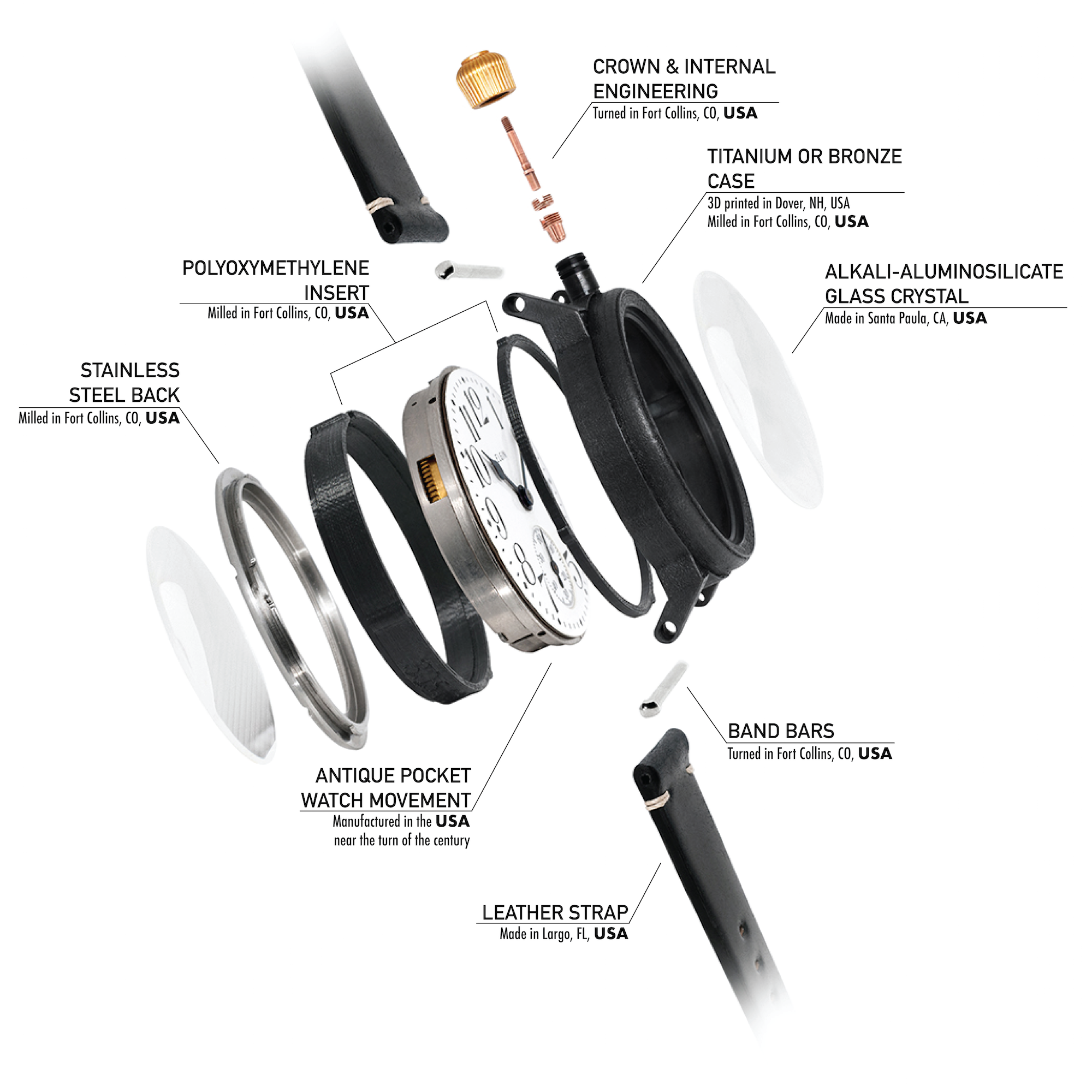 The dual crystals on each watch are made from Corning Gorilla Glass and precision cut by Abrisa in Santa Paula, CA. Gorilla Glass is known for its use on smartphones, and it is used to encase Vortic’s watches for its superior clarity, resistance to shattering, and scratch resistance.