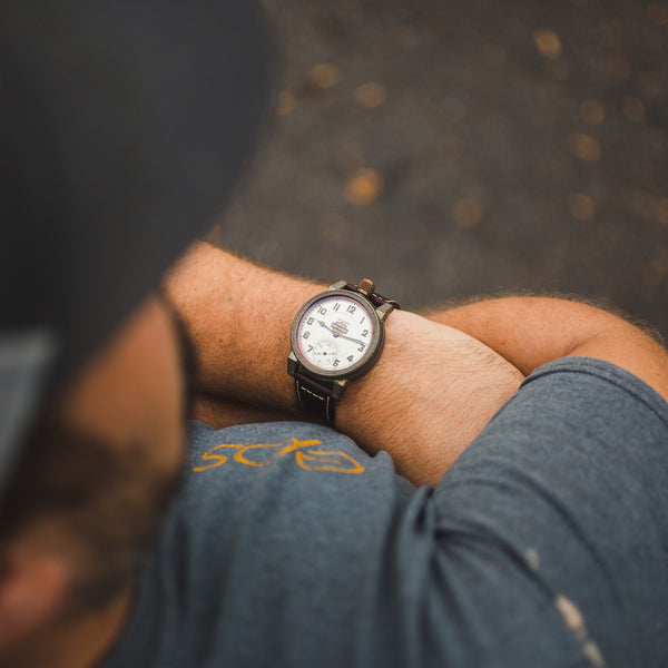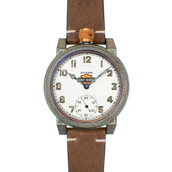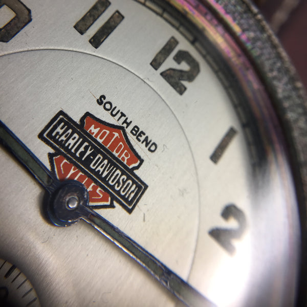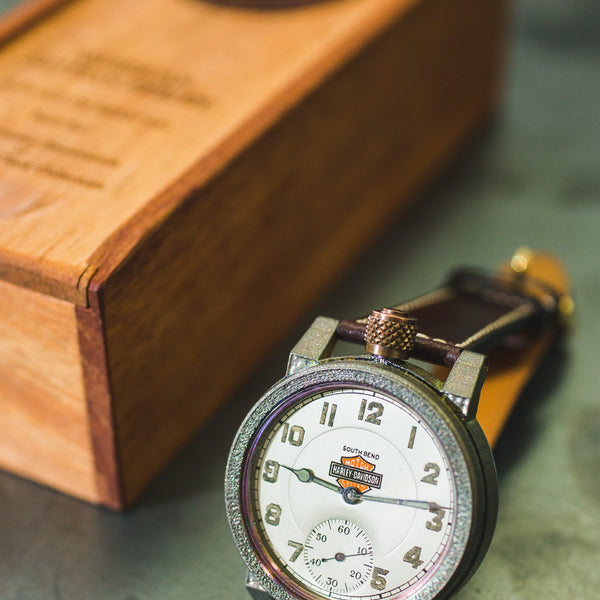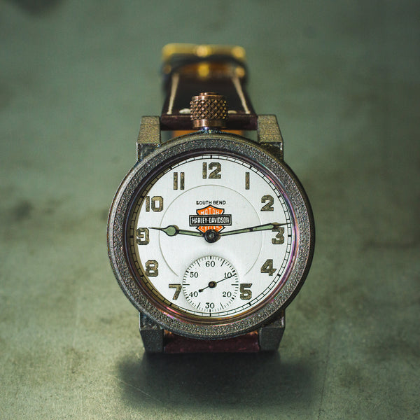 We are always on the hunt for special American made pocket watch movements to salvage from the scrapyards, restore, and preserve in our wrist watches. Recently one of our pickers came across a true masterpiece. An original South Bend pocket watch movement featuring the Harley-Davidson logo. It was quite literally at the bottom of a pile of rusted movements that had been discarded when their likely gold or silver cases were melted down. We knew we had to do something special with this one.
