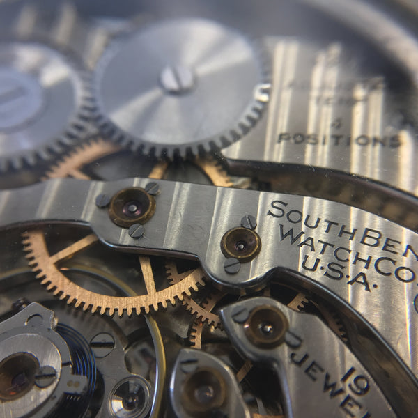 The original antique movement inside this piece was built into a pocket watch by the South Bend Watch Company in South Bend, Indiana in 1920. It features 19 jewels and a beautiful bridge design. The movement has been expertly restored to its original condition and is keeping great time. Originally adjusted to 4 positions, this would have been a high quality and potentially expensive pocket watch.