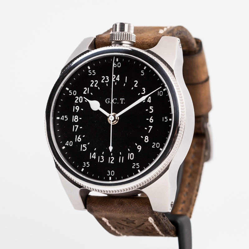 Called the Master Navigational Watch, these pocket watches were used by the Navigator on Bomber aircraft like the B-17, B-24, and B-29. Each dial was marked with "GCT," known at the time as Greenwich Civil Time because that was the standard European timezone. Now called UTC or Coordinated Universal Time, it relates to the time at 0 degrees Longitude which is the location of the Royal Observatory in Greenwich, England.