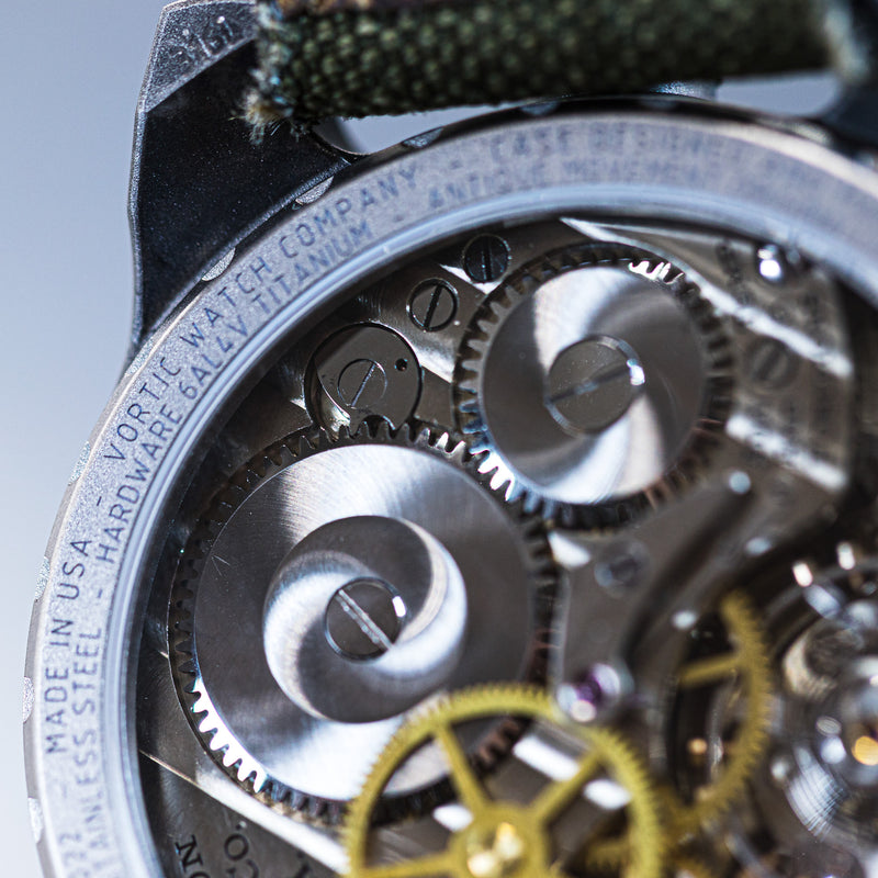 The Military Edition is a special example of this technology and has been over-built to house these extremely rare and valuable military mechanisms. Every case component has been precision cut from blocks of 316L Stainless Steel, Aluminum Bronze and Titanium inside Vortic's Colorado manufacturing facility.