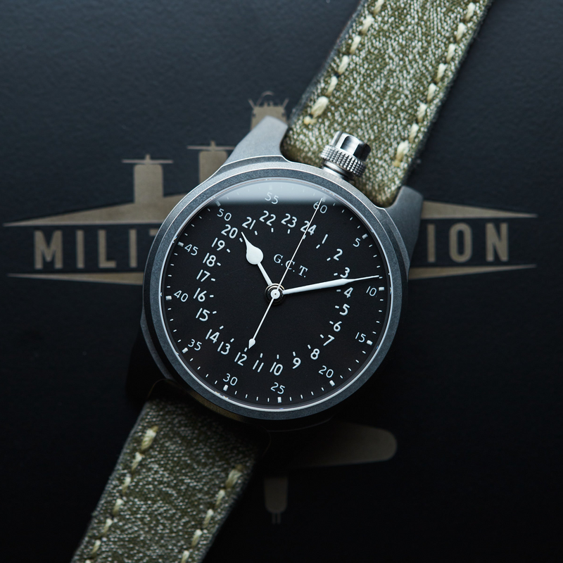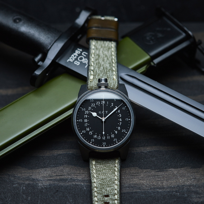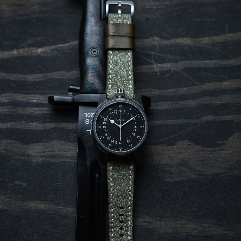 For the Sixth Edition in 2024, one strap is hand-cut from Swiss military green canvas. The army green canvas strap gives even more meaning to the name Military Edition.
