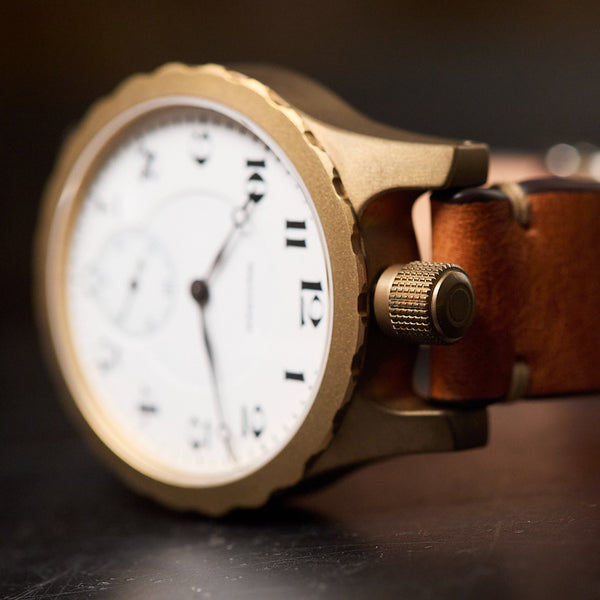 We encased this historic mechanism in our sandblasted bronze case, a material that slowly develops its own patina, ensuring the watch becomes even more personal as it’s worn. The notched bronze bezel frames the dial with distinctive texture, and the knurled bronze crown offers both visual balance and a satisfying grip. Completing the watch is a rye-toned American-made leather strap that warms the overall look and grounds the piece in a classic, understated style.