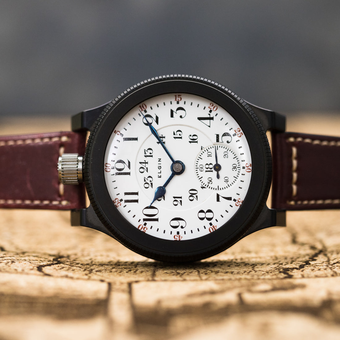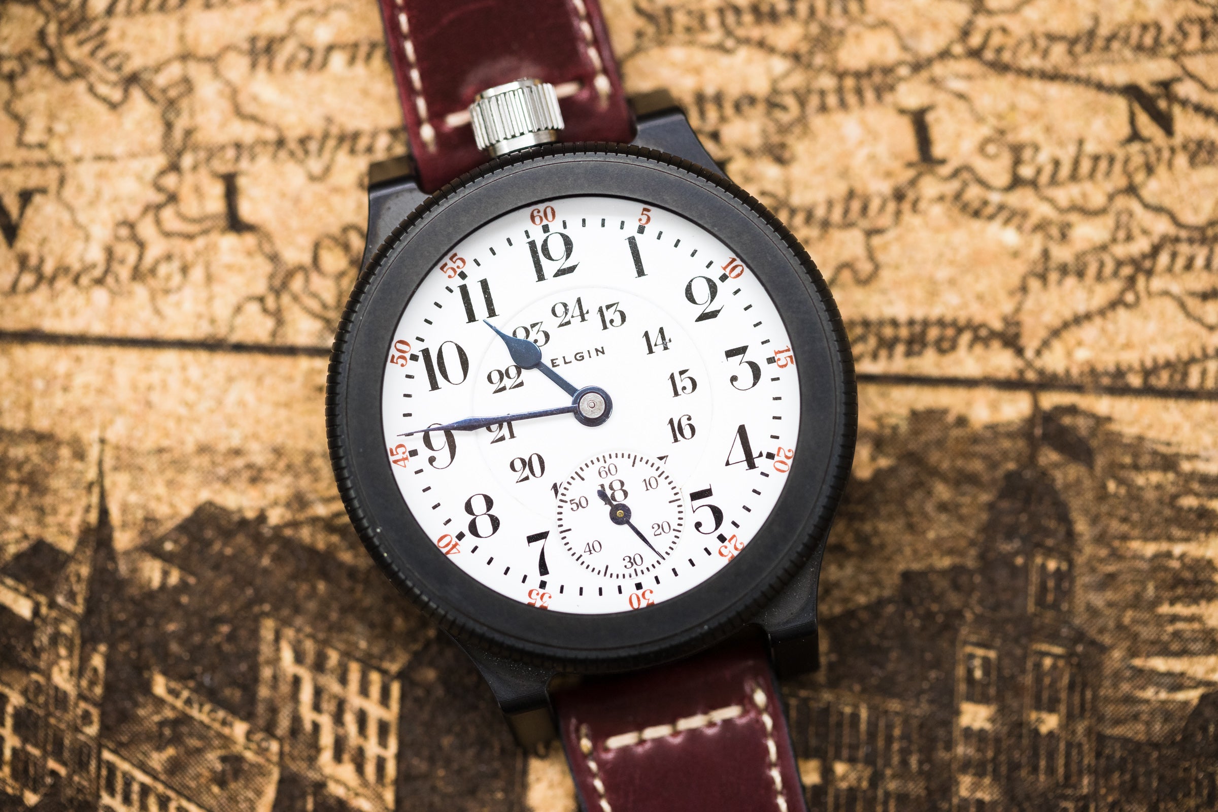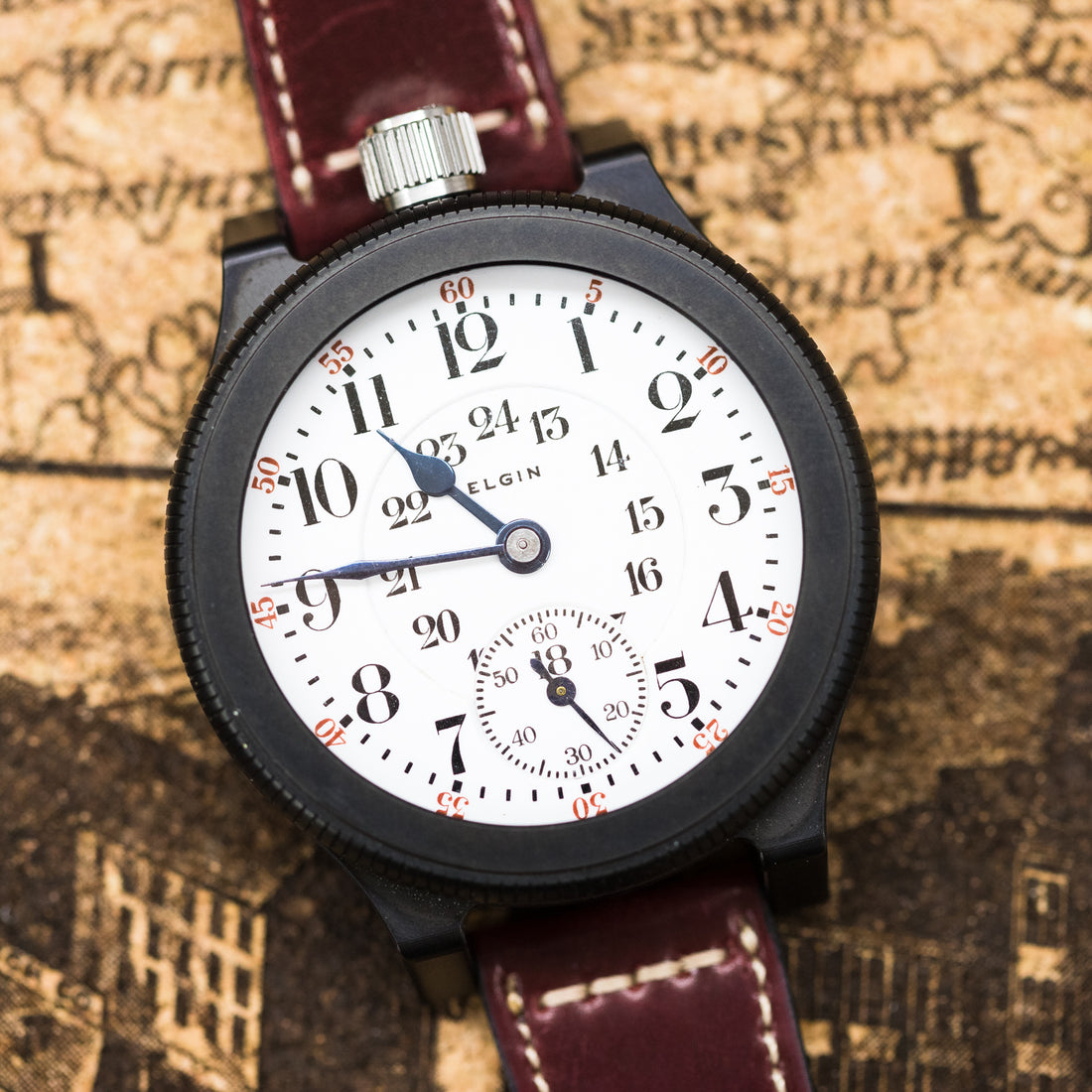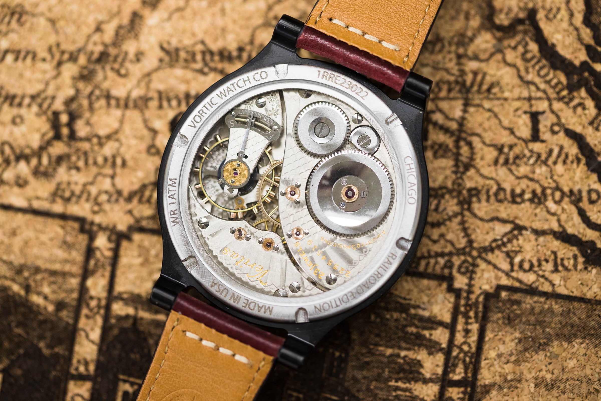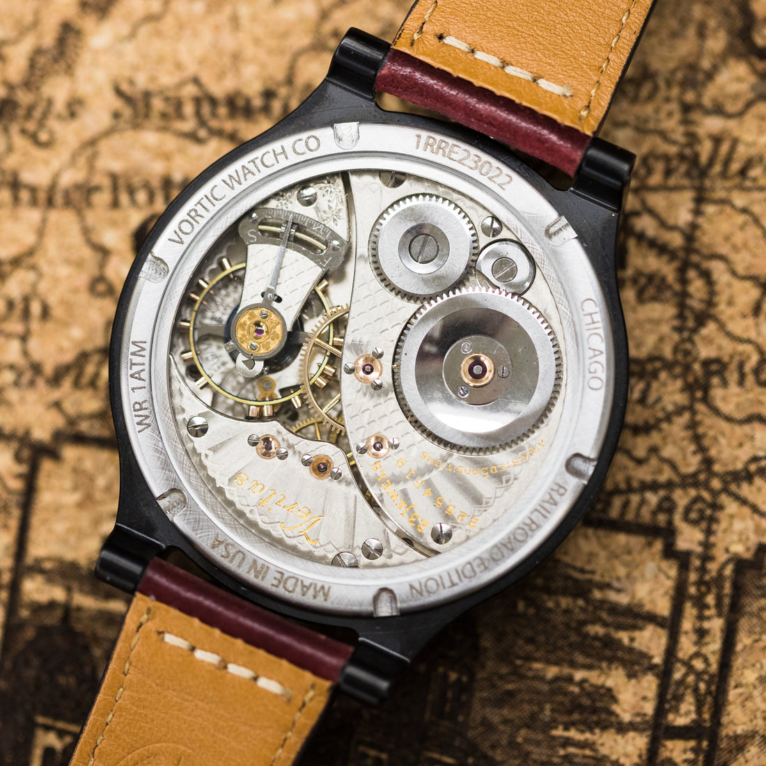 The Chicago Railroad is the 22nd one-of-a-kind piece in Vortic's "Chicago Railroad" line of the American Artisan Series. This watch contains the original movement (timepiece), dial (face), and hands from a vintage (1880’s – 1950’s) pocket watch. The American Artisan Series is a line of fully American Made wristwatches powered by restored, U.S. made pocket watch movements.