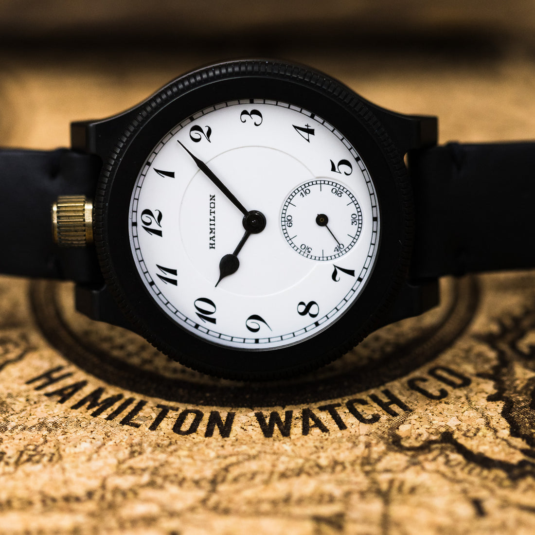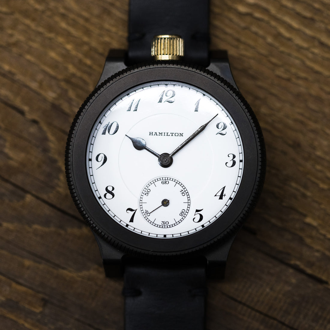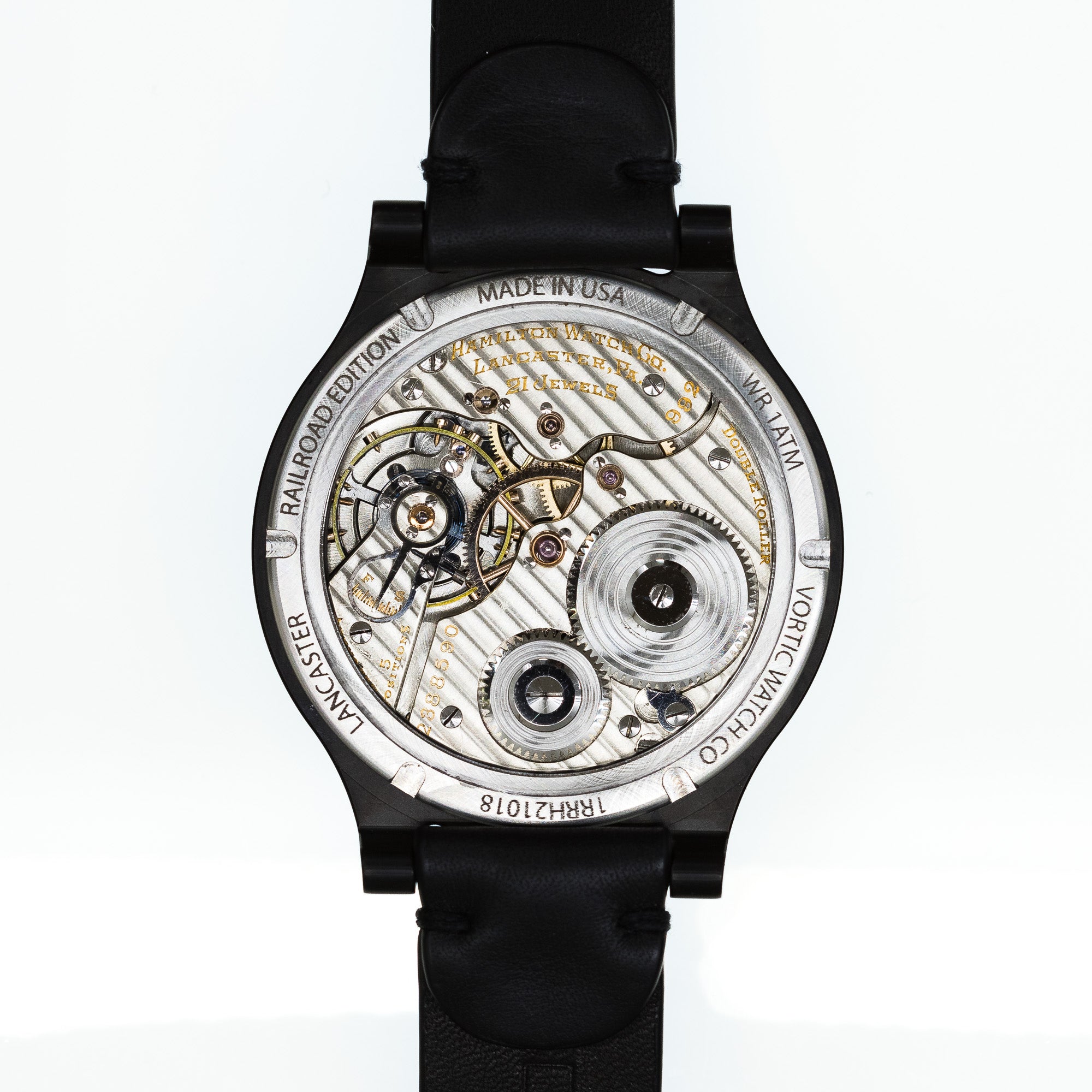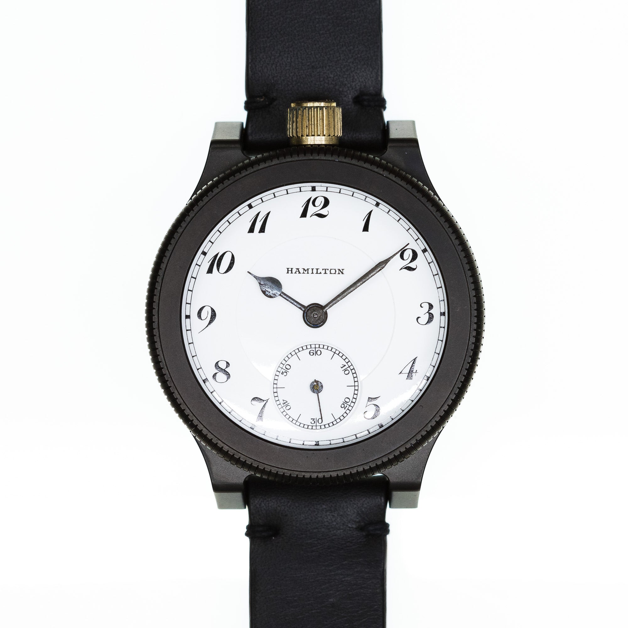 What makes the Lancaster Railroad 018 Unique: THIS IS THE FIRST LANCASTER MODEL WE HAVE DONE IN YEARS! This watch features a Hamilton movement and dial upcycled into our DLC titanium case (we are in no way affiliated with the Hamilton Watch Company). Despite being almost 100 years old, the crisp clean dial is undeniably modern and fresh. The rich black leather straps, matte black DLC case, and bronze crown bring an understated elegance to this piece of history. The movement was made in 1926, the same year the restoration of Colonial Williamsburg began.