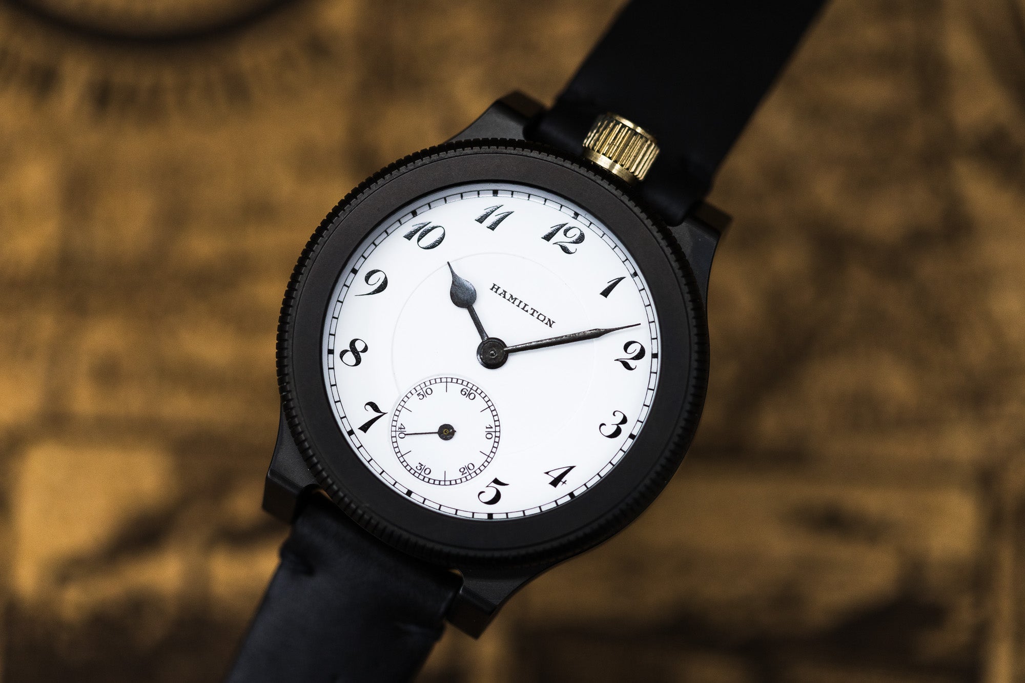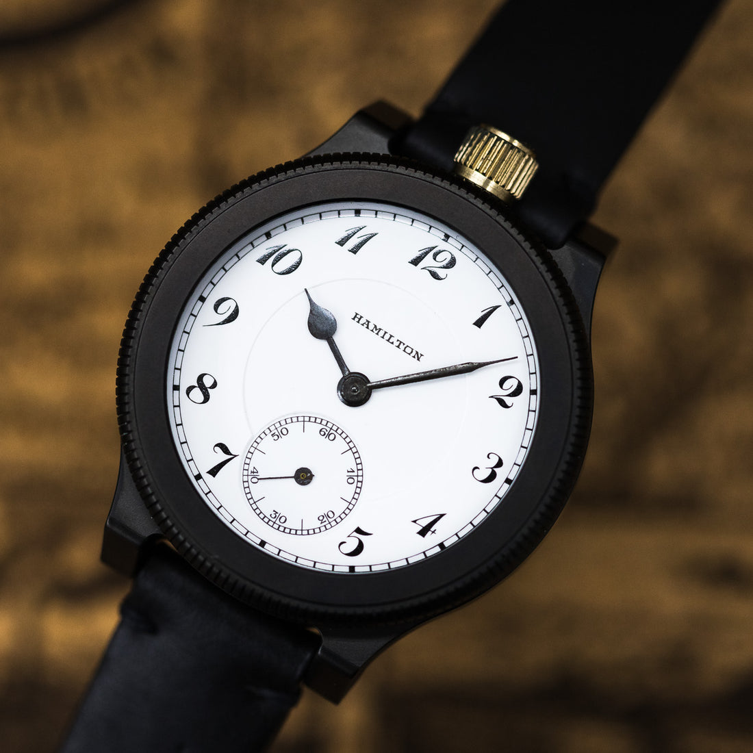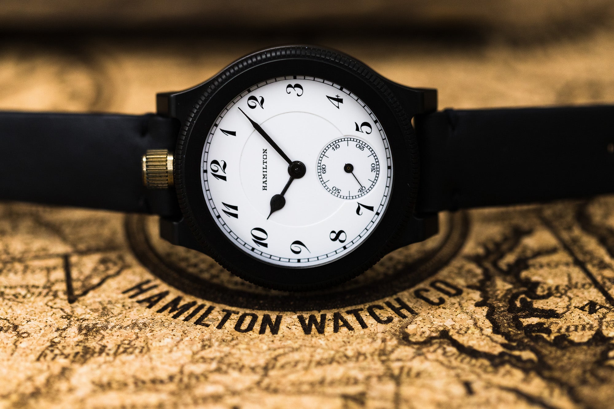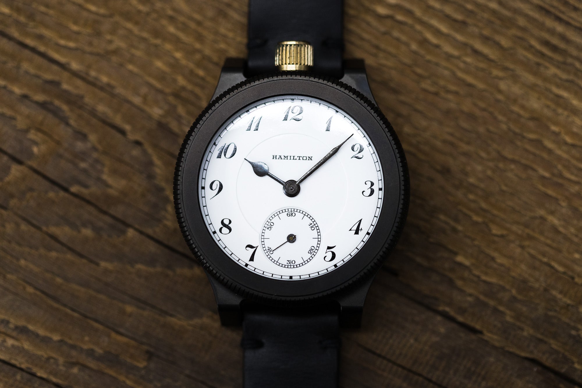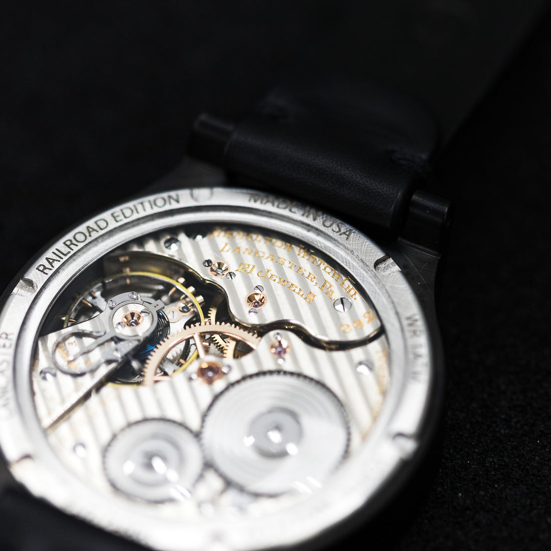 What makes the Lancaster Railroad 018 Unique: THIS IS THE FIRST LANCASTER MODEL WE HAVE DONE IN YEARS! This watch features a Hamilton movement and dial upcycled into our DLC titanium case (we are in no way affiliated with the Hamilton Watch Company). Despite being almost 100 years old, the crisp clean dial is undeniably modern and fresh. The rich black leather straps, matte black DLC case, and bronze crown bring an understated elegance to this piece of history. The movement was made in 1926, the same year the restoration of Colonial Williamsburg began.