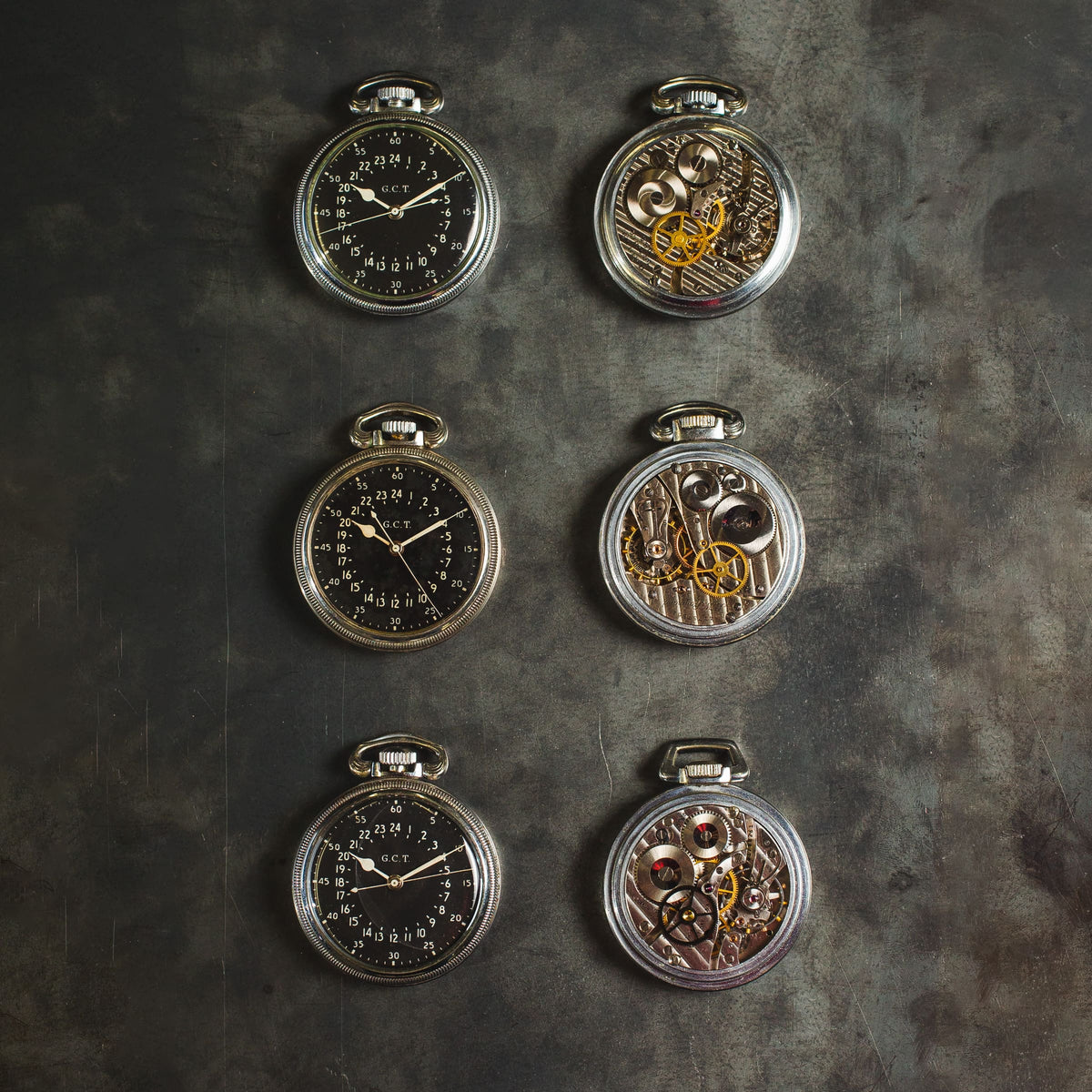 Called the Master Navigational Watch, these pocket watches were used by the Navigator on Bomber aircraft like the B-17, B-24, and B-29. Each dial was marked with "GCT," known at the time as Greenwich Civil Time because that was the standard European timezone. Now called UTC or Coordinated Universal Time, it relates to the time at 0 degrees Longitude which is the location of the Royal Observatory in Greenwich, England.