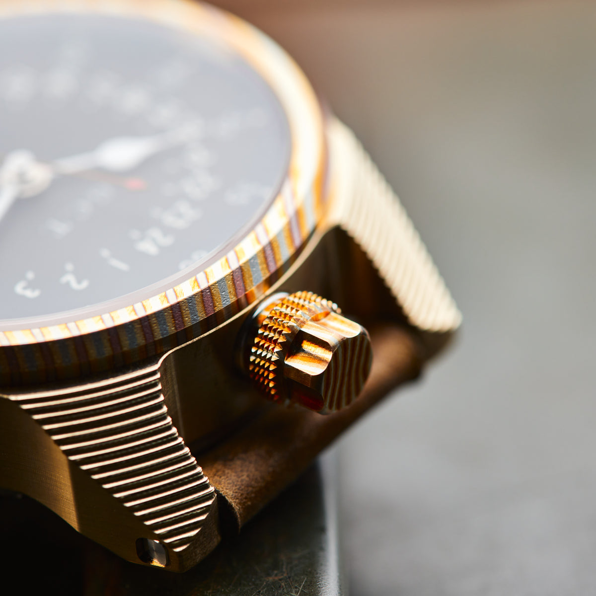 The bezel and crown are made from Mokume and the case is made from bronze, all machined here in our Fort Collins, Colorado manufacturing facility. It looks awesome now, but just wait until it starts to patina...