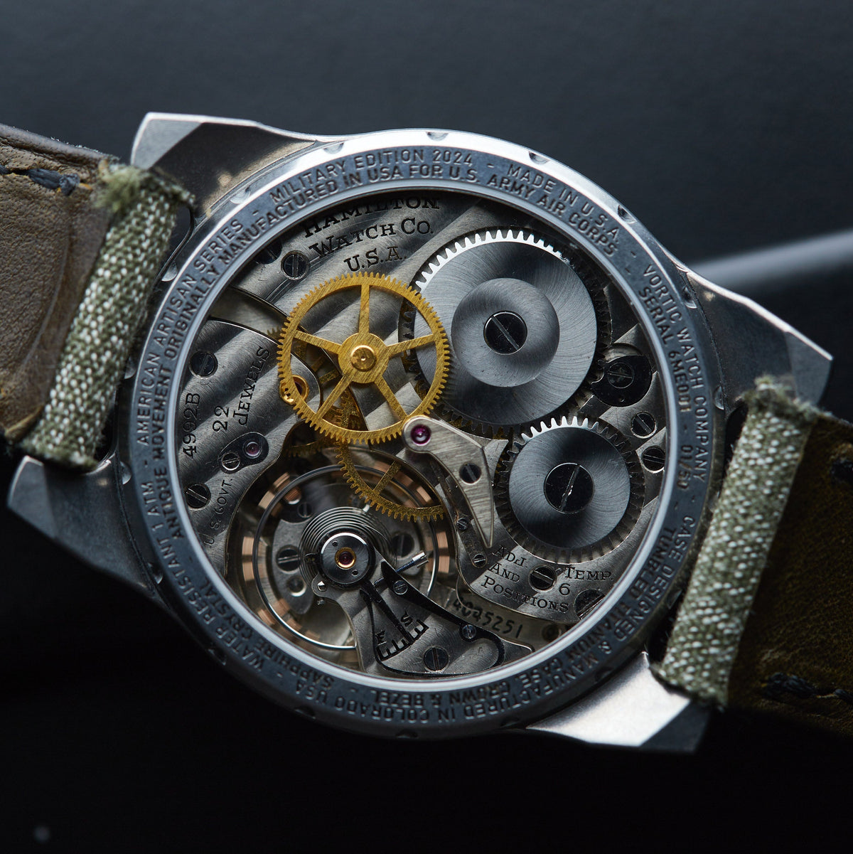 Every watch in the Sixth Edition contains an original antique Hamilton 4992B movement. Please note we are only making 50 pieces this year, and they may sell quickly. The first 20 pieces (serial numbers 01/50 through 20/50) will have modern lume applied to the antique dial. The lume is also applied to the antique hands and those first 20 all feature the rare "US GOVT" stamp on the movement. The other 30 (serial numbers 21/50 through 50/50) will be the standard, original antique dial, and the movements are from the other 90% of Hamilton's production during the war (they are not stamped "US GOVT").