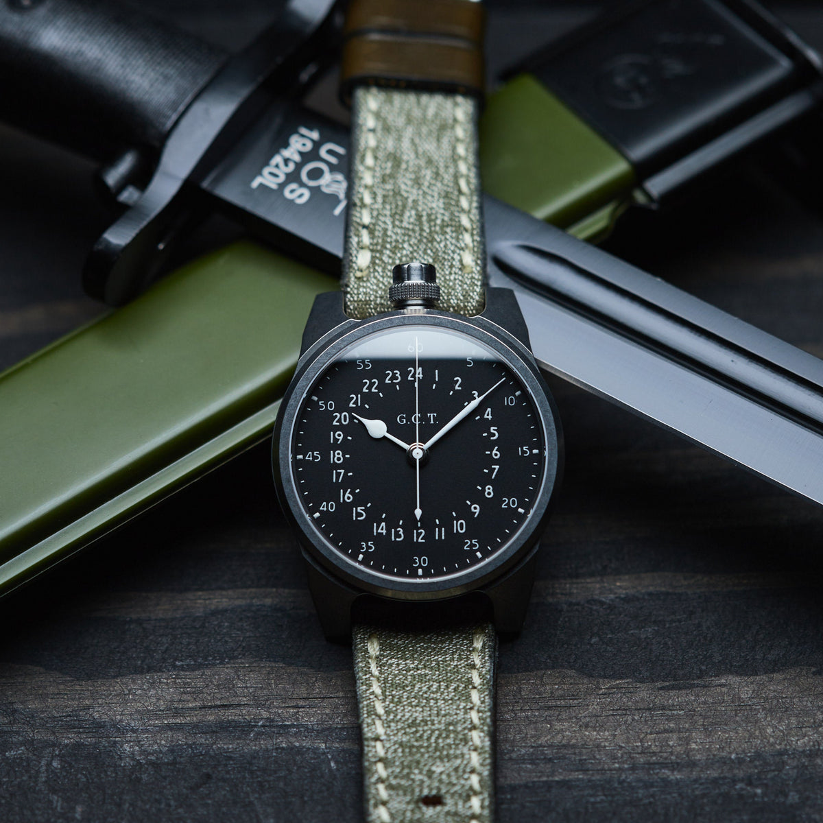 Each Military Edition watch will come with one Swiss military canvas strap, and one black leather strap with vintage white stitching, all made by Greg.
